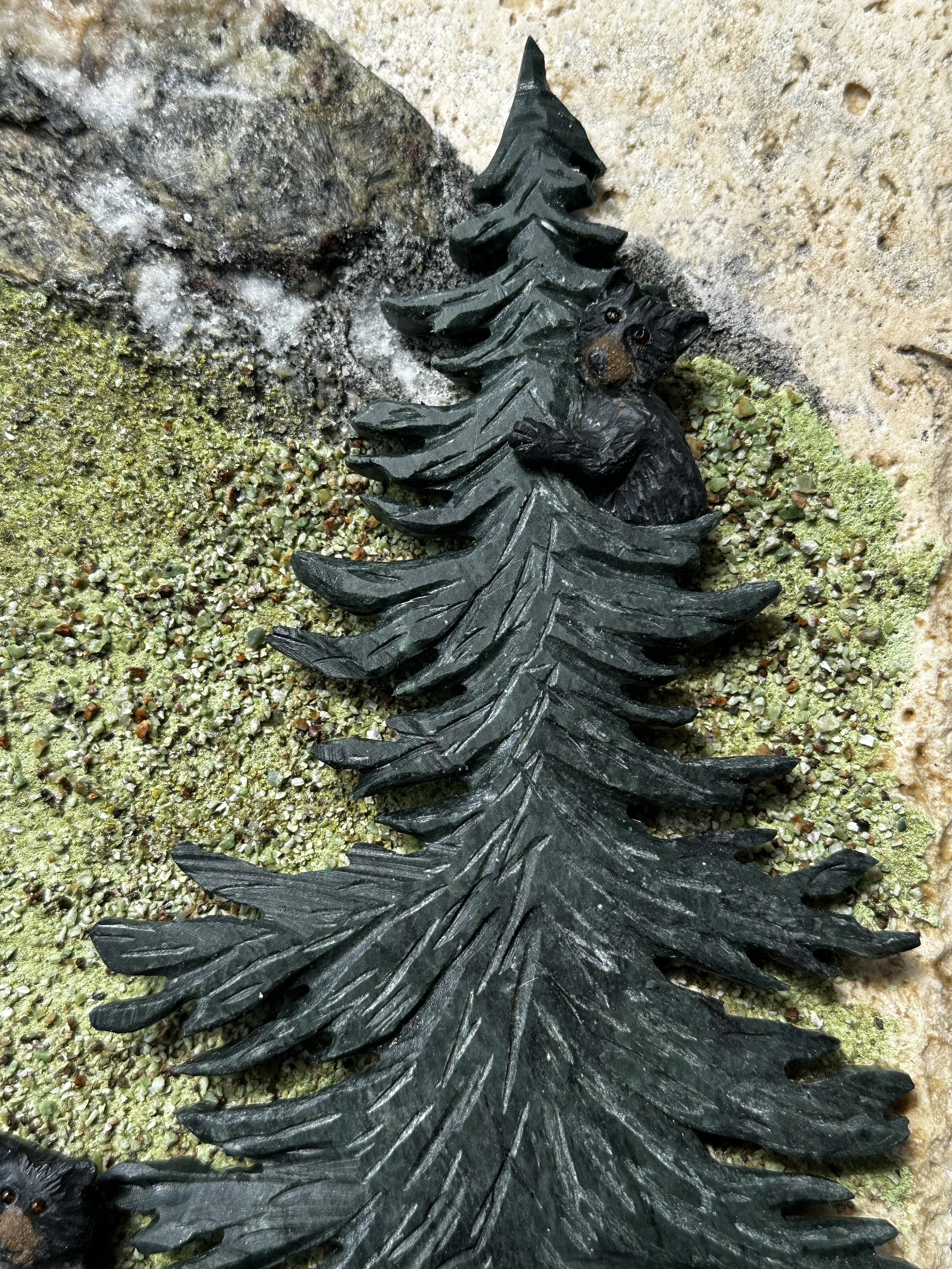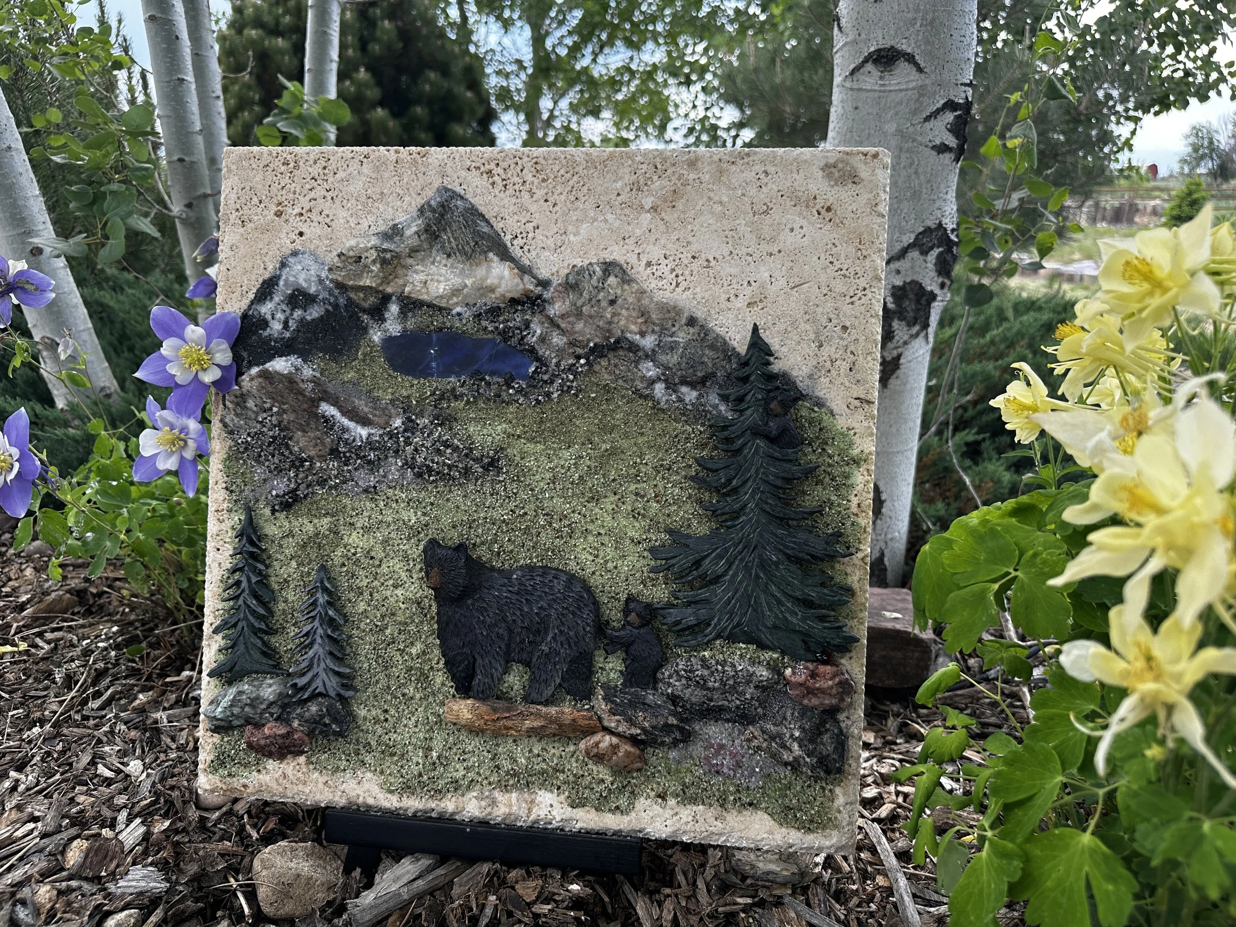 Limestone black mama bear, with tiger eye eyes and crushed tiger eye muzzle, stands on a petrified wood log, to better guard her cubs. The cubs stopped to play in the green granite pine trees on their way to the chrysoprase meadow, ripe with amethyst purple wildflowers, below the vibrant blue sodalite lake.