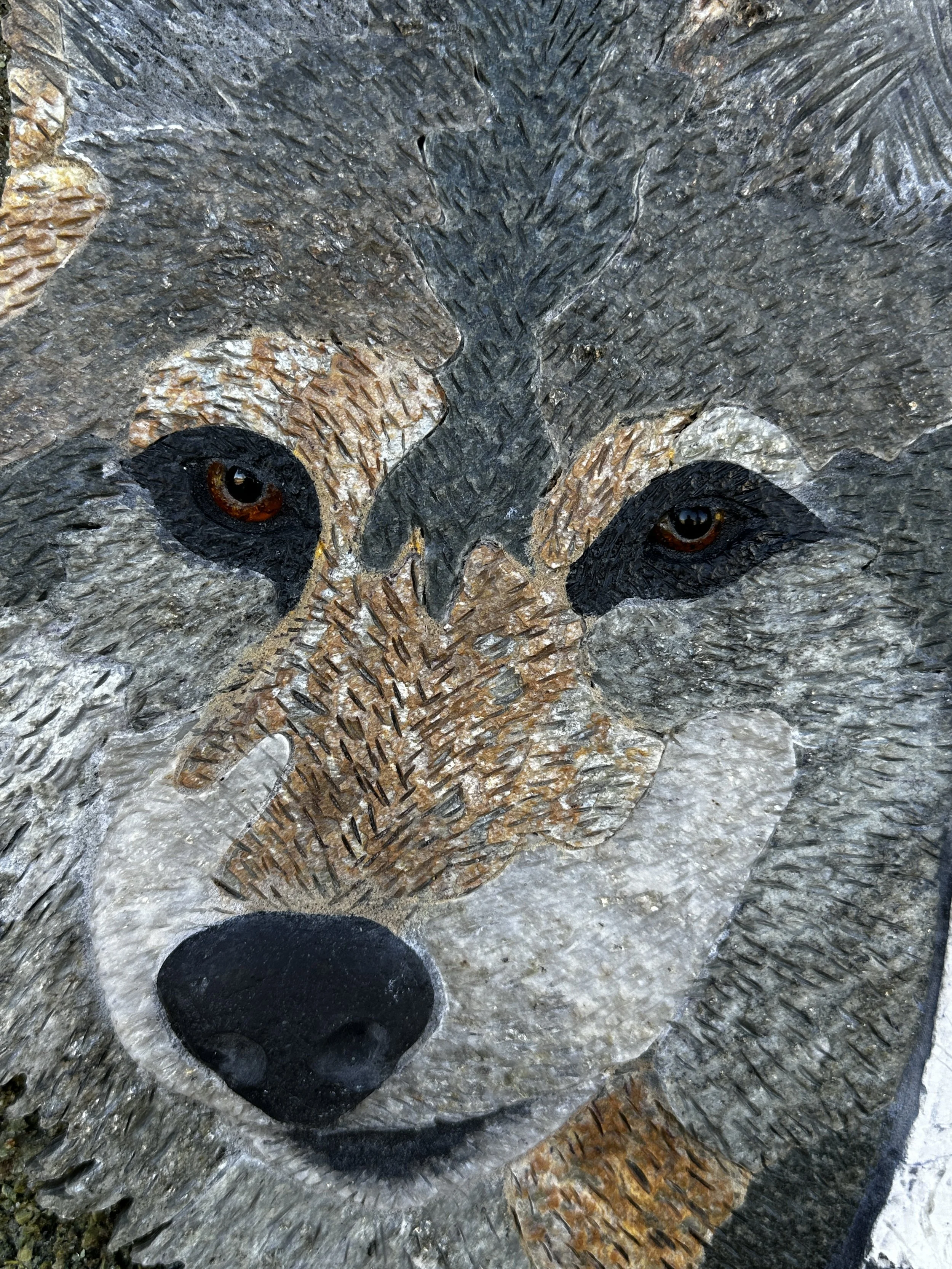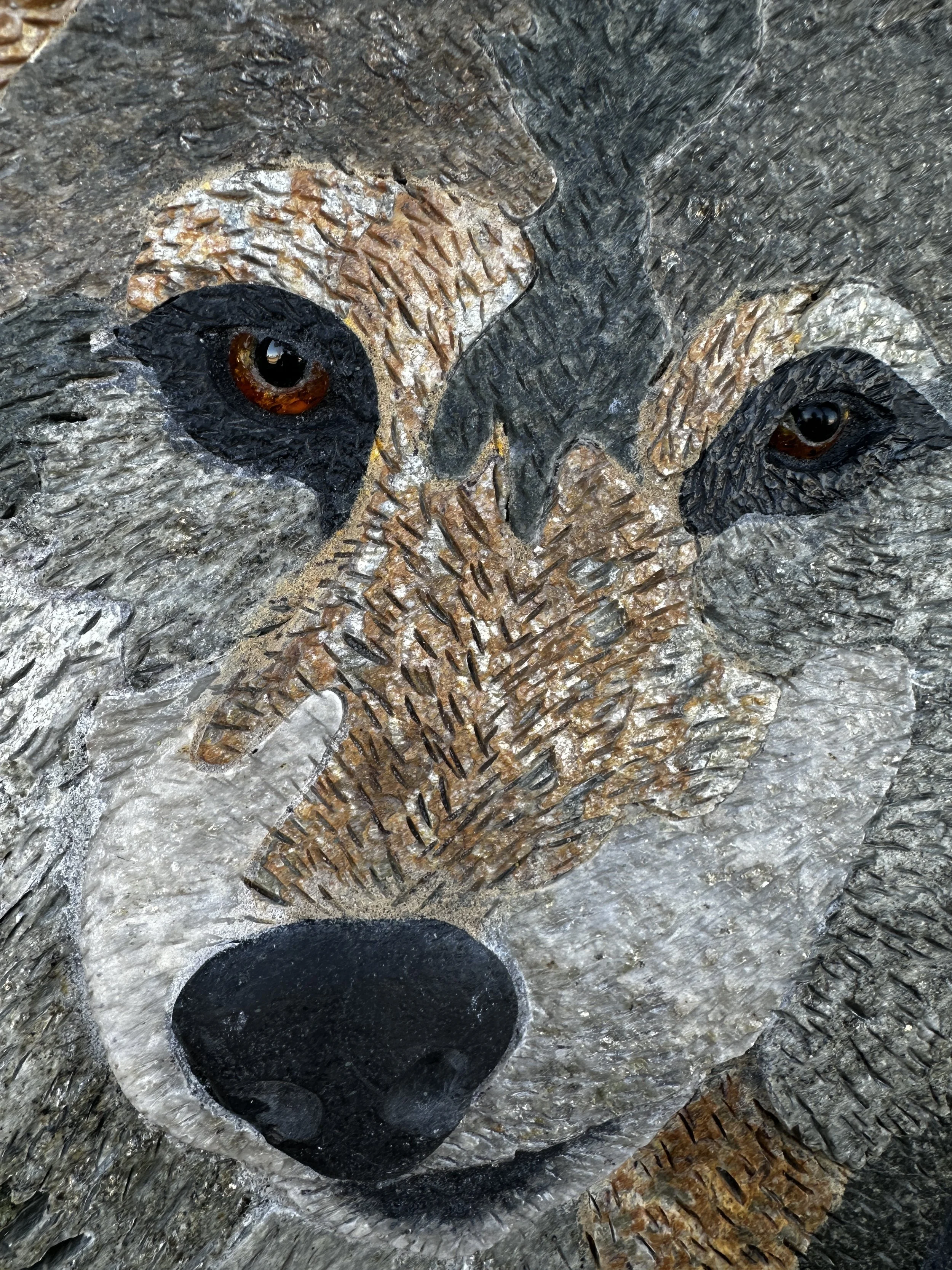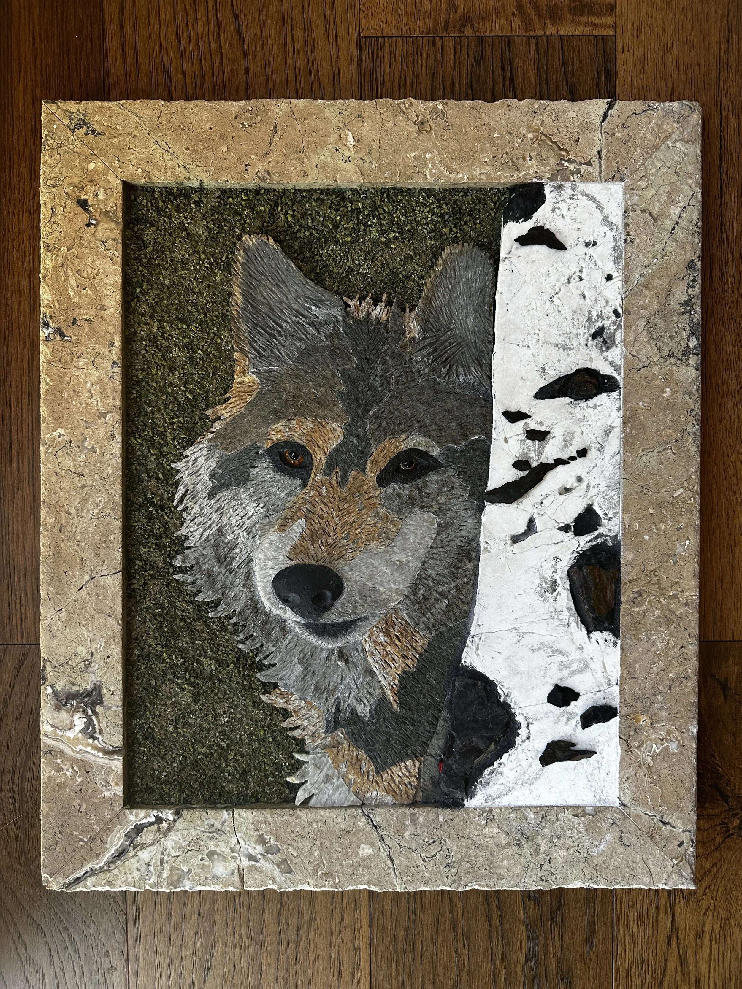 This noble grey wolf is made from 38 pieces of Colorado Grey stone, black Limestone, golden Schist, silver and dark grey Phyllite, and milky Quartz, meticulously cut and pieced together. His nose is black stone from a river bed. His penetrating eyes of cognac Amber and black Agate pupils, peer from behind the safety of a Terra Nuova Brushed Marble Aspen tree with black slate knots, growing in a crushed Serpentine, Peridot & Chrysoprase forest.